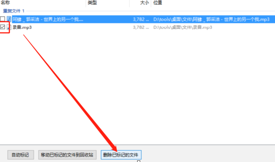 5.开始扫描之后我们就等到软件返回扫描的结果,然后在扫描出来的重复文件界面中选择想要删除的那一个重复文件,选中之后点击右下角的删除已标记的文件按钮即可将它删除掉。