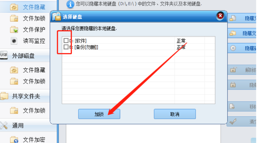 2.点击隐藏硬盘之后接下来在界面中会出现一个选择硬盘的界面,在这个界面中我们勾选想要隐藏的硬盘之后点击下方的加锁按钮。