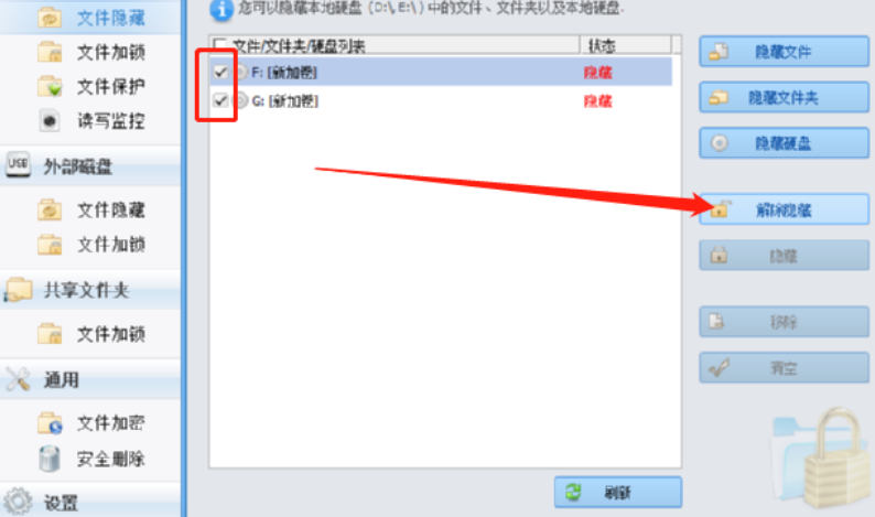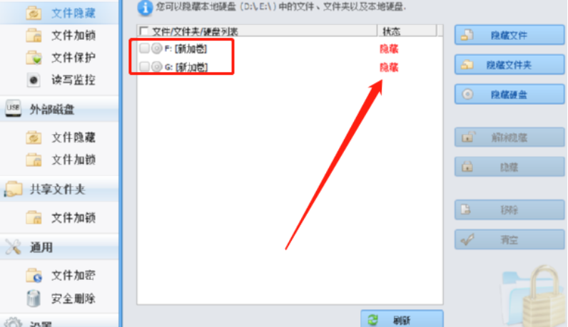 3.点击加锁按钮之后,在我们的界面中就可以看到选择的磁盘以及它们已经被隐藏的状态了,在界面中可以看到隐藏的硬盘列表。