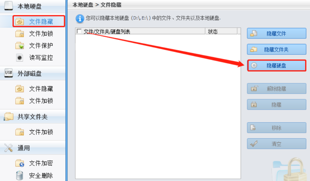 1.首先第一步我们打开软件之后在界面左边的本地硬盘模块中点击文件隐藏功能,然后在出现的右边界面中点击隐藏硬盘选项。