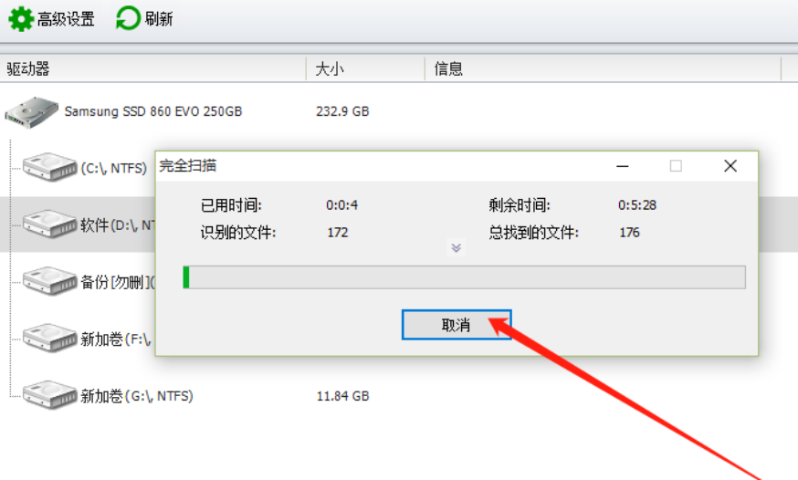3.点击下一步按钮之后软件就会自动开始扫描磁盘中的媒体文件了,我们可以看到一个提示扫描进度的界面,需要中止扫描的用户点击取消按钮即可。