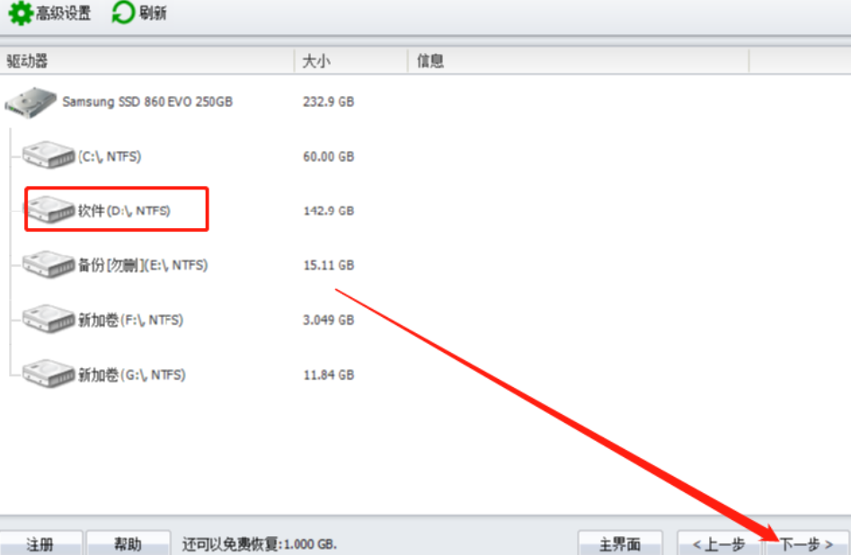 2.点击进入到恢复媒体文件的界面之后,我们会来到下图所示的界面,在这个界面中选中想要恢复文件的磁盘点击下一步按钮。