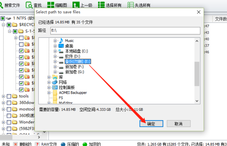 6.点击保存到之后会出现一个供我们选择文件储存路径的界面,我们选择好文件恢复之后的储存路径之后点击确定按钮即可。
