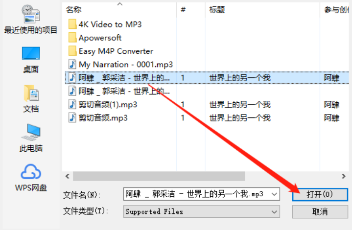 2.点击添加按钮之后紧接着会打开一个选择文件的界面,在这个界面中我们找到目标MP3文件之后点击选中,再点击打开按钮。