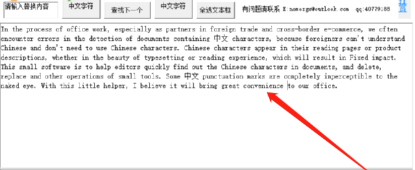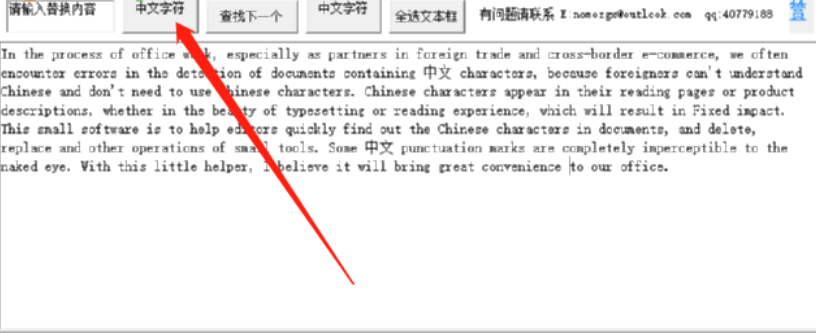3.要查找的文档复制粘贴到软件之后,我们需要点击界面上方的查找所有中文字符这个功能按钮,点击之后即可开始查找。