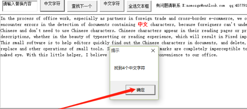 4.等到查找完成之后软件会弹出一个提示找到多少个中文字符的界面,如下图中所示,我们点击确定按钮即可关闭这个提示界面。