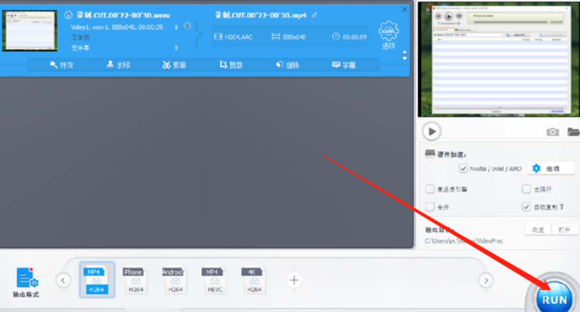 7.点击完成按钮之后就回到了软件的主界面,最后我们点击界面右下角的Run按钮就可以开始剪切选择好的视频片段了。