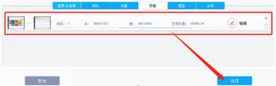 6.点击剪辑按钮之后在下方的界面中就会出现我们选择好的剪切片段了,然后我们在点击界面下方的完成按钮。