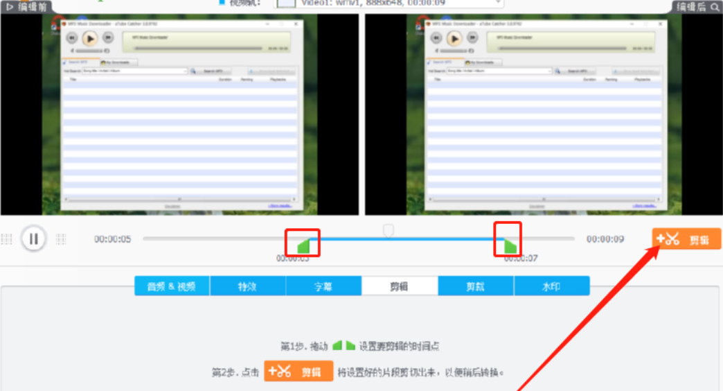 5.点击剪辑之后就进入到视频的剪辑功能界面当中了,我们移动视频进度条上面的两个绿色图标,然后选择想要剪切视频片段,选择完成之后点击旁边的剪辑按钮。