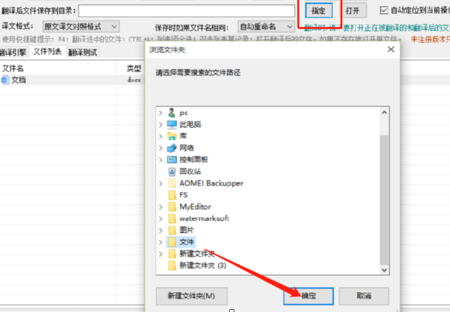 3.将需要翻译的文件添加成功之后,下一步是在界面中点击保存目录选项后面的指定这个按钮,点击之后可以选择文件翻译之后需要储存的位置。