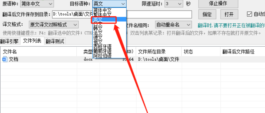 5.最后选择好要翻译的目标语种之后,鼠标点击想要翻译的Word文件,选中之后就可以按下键盘的F4键开始翻译文件了。