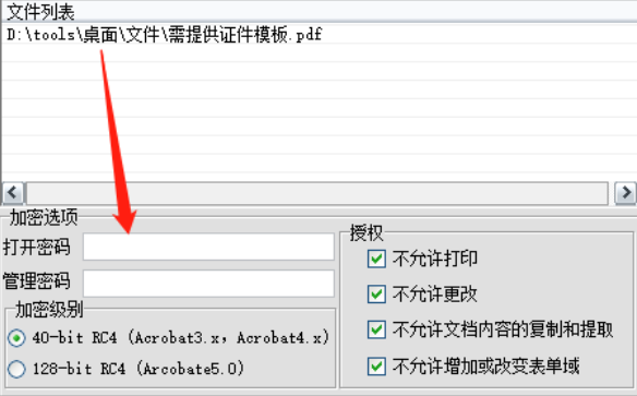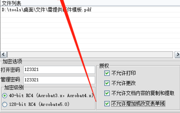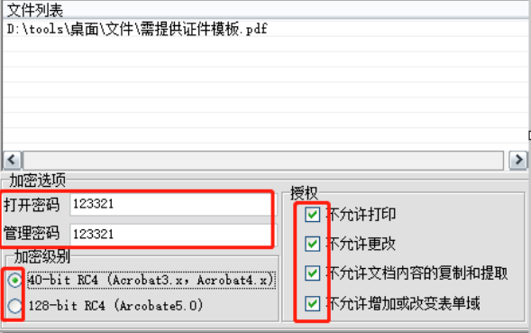 4.根据需求输入密码之后,在界面中还可以对加密级别和授权进行选择,授权就是打开文件之后是否可以打印、更改等,用户根据需求设置勾选即可。