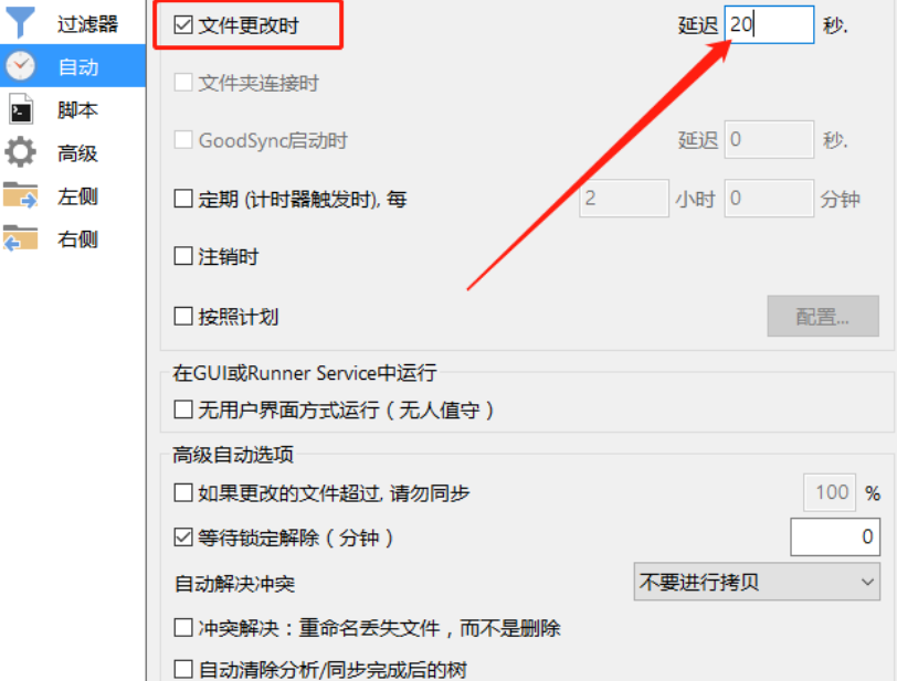 7.等到打开设置自动备份界面之后,我们勾选文件更改时这个选项,然后设置好延迟多少秒进行自动备份,这样文件被修改之后就会自动备份了。