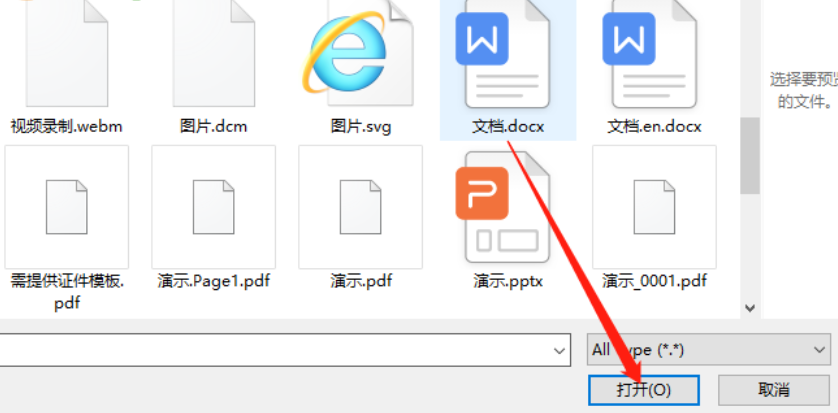 2.点击加号之后紧接着会打开一个选择文件的界面,打开这个界面之后我们就可以在其中找到想要转换的Word文件选中并点击打开按钮了。
