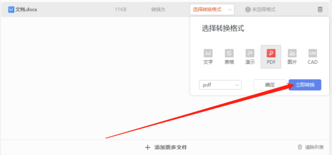 3.点击打开按钮之后下一步文件就成功添加到软件界面了,然后我们在选择转换格式的选项中点击即可打开选择PDF文件格式。