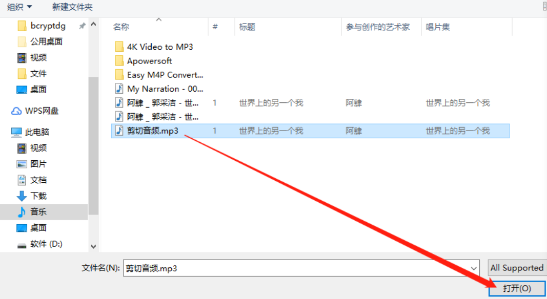 2.点击添加文件之后,我们在出现的界面中选中想要转换的MP3文件,点击界面右下角的打开按钮即可。