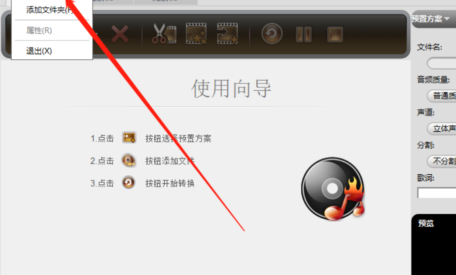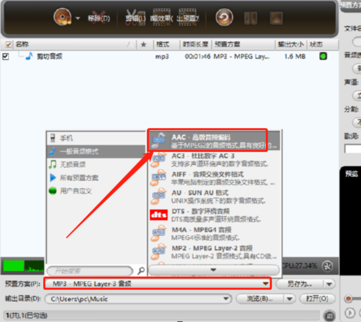 3.点击选择好想要转换的音频文件之后,下一步就是在界面中点击预置方案旁边的下拉列表,打开之后就可以选择我们想要的AAC格式了。