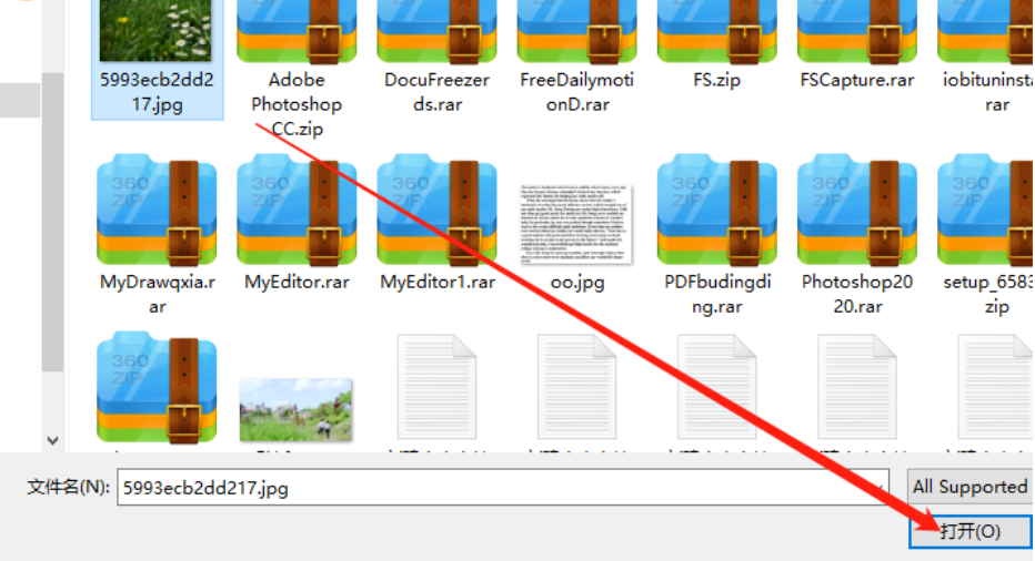 2.点击添加文件按钮之后,紧接着会打开一个选择文件的界面,在这个界面中我们选中目标jpg图片文件之后点击右下角的打开按钮。