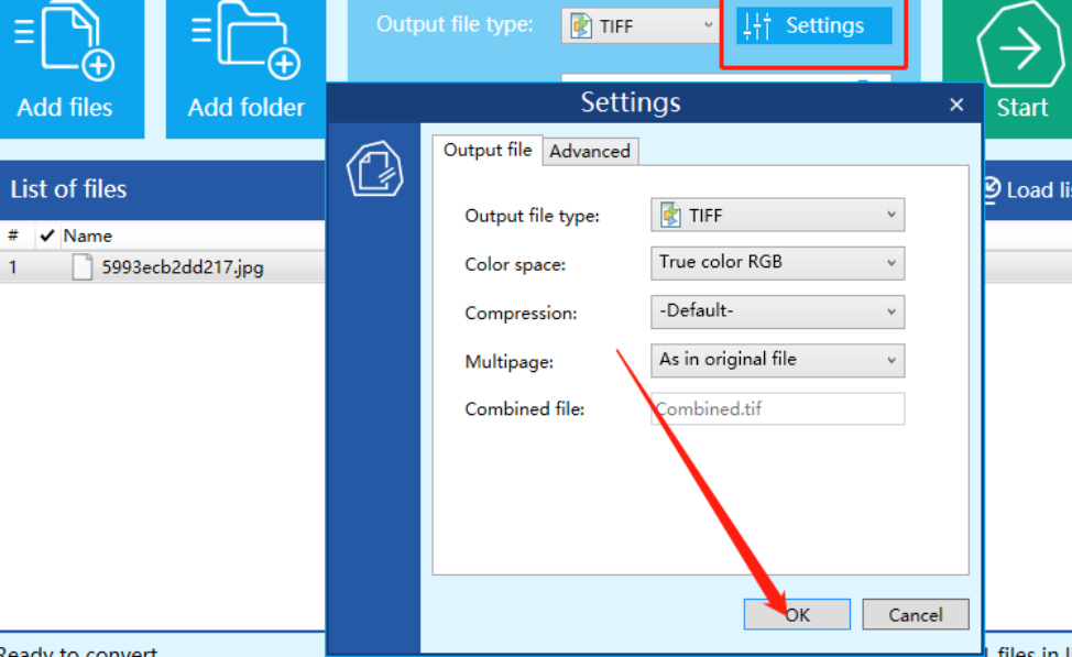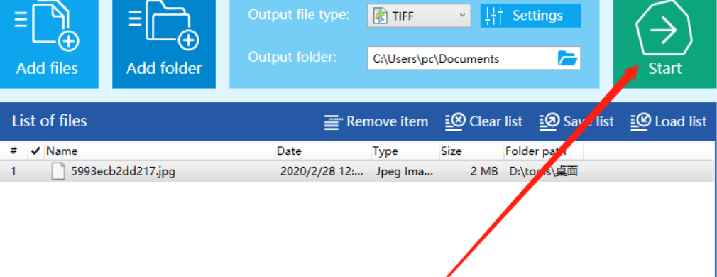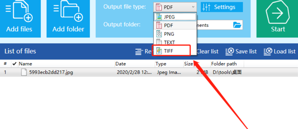 3.点击打开按钮之后下一步就是回到软件界面中,然后打开输出类型的下拉列表,在其中选择我们需要的TIFF类型。