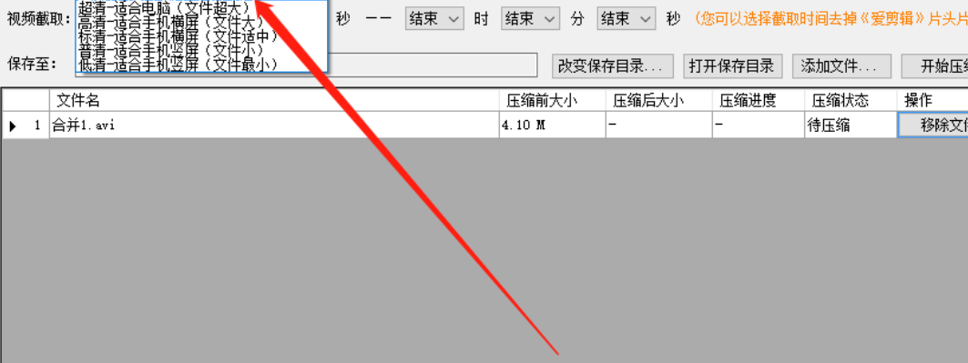4.选择好压缩的尺寸和清晰度之后,我们点击改变保存目录按钮可以自定义更改视频文件压缩之后的储存目录。