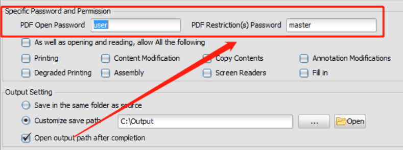 5.我们将两个密码都输入完成之后可以在下方的一些权限选项中设置勾选哪些权限,包括读写权限、打印权限等,根据用户的需求选择即可。