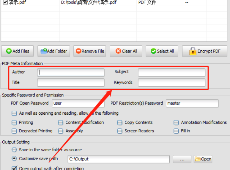 3.点击打开按钮之后下一步就是在界面的PDF文件信息模块中为这个PDF文件编辑一些信息了,包括作者、标题、关键词等。