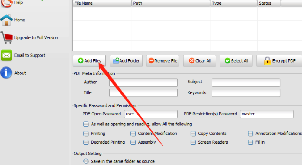 1.首先第一步我们打开软件之后在软件的主界面中点击Add Files这个功能按钮,点击之后即可添加要加密的PDF文件。