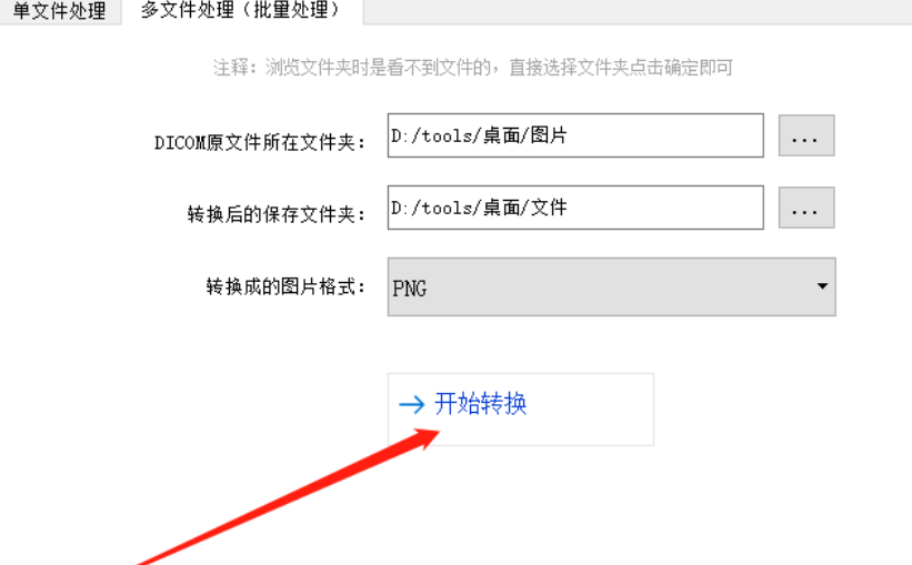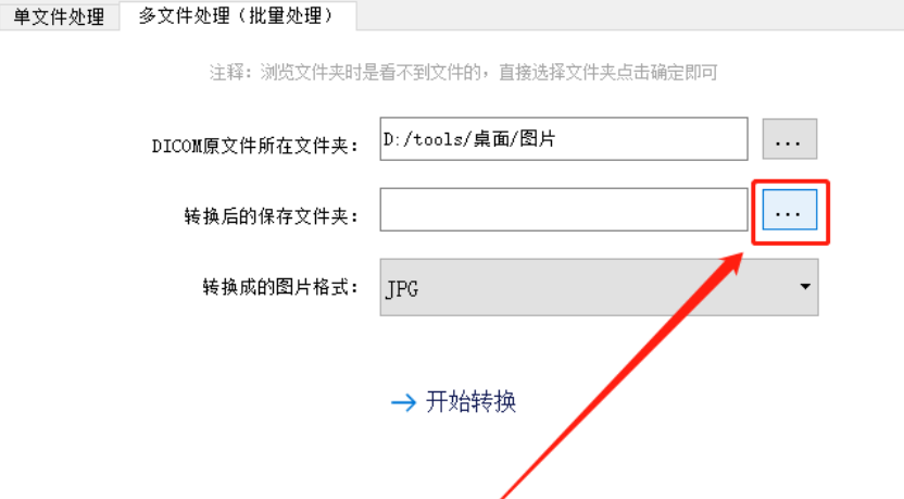 1.首先第一步我们打开软件之后在软件中切换到多文件处理这个功能界面,然后点击DICOM原文件所在文件夹这个选项后面的三点按钮。