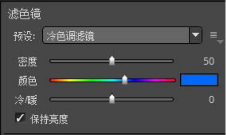 三,接下来,我们可以通过“滤色镜”的操作,使图片的冷调变得突出起来。因为拍摄的时间是冬天,我们要在加滤镜的同时不能忘记本色,因此我们点击右侧工具栏中的颜色,选择滤色镜下的“冷色调滤镜”,以达到强调冬天的目的。