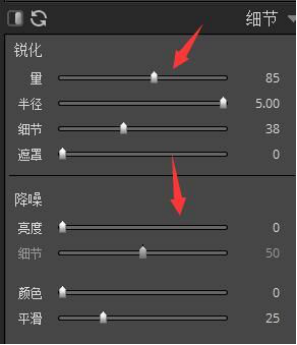 五,我们调完大致效果之后,就可以使用细节调色功能了,点击右侧工具栏中的“细节”,细节调色功能分为锐化和降噪两部分,我们可以对其分别进行调整。