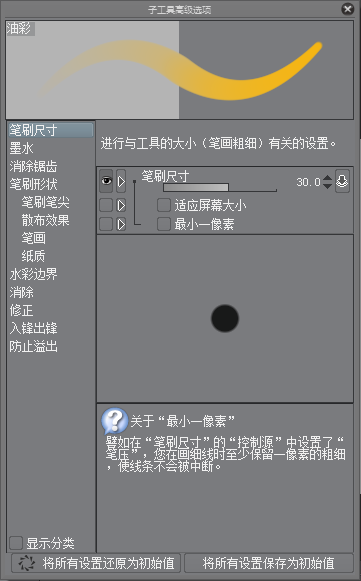 六, 子工具高级选项面板 用于对工具进行更加详细的设置。您可以在此查看设置项目介绍、设置方法,或预览效果。单击
