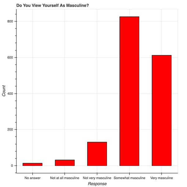 红色的条形图表示 538 个人关于「你认为自己有男子汉气概吗?」这一问题的答案。9~14 行的 Bokeh 代码构建了优雅且专业的响应计数直方图——字体大小、y 轴刻度和格式等都很合理。