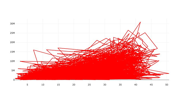 #plot 1 - barplot # **note** - the layout lines do nothing and trip no errors data = [go.Bar(x=team_ave_df.team, y=team_ave_df.turnovers_per_mp)] layout = go.Layout( title=go.layout.Title( text='Turnovers per Minute by Team', xref='paper', x=0 ), xaxis=go.layout.XAxis( title = go.layout.xaxis.Title( text='Team', font=dict( family='Courier New, monospace', size=18, color='#7f7f7f' ) ) ), yaxis=go.layout.YAxis( title = go.layout.yaxis.Title( text='Average Turnovers/Minute', font=dict( family='Courier New, monospace', size=18, color='#7f7f7f' ) ) ), autosize=True, hovermode='closest') py.iplot(figure_or_data=data, layout=layout, filename='jupyter-plot', sharing='public', fileopt='overwrite') #plot 2 - attempt at a scatterplot data = [go.Scatter(x=player_year.minutes_played, y=player_year.salary, marker=go.scatter.Marker(color='red', size=3))] layout = go.Layout(title="test", xaxis=dict(title='why'), yaxis=dict(title='plotly')) py.iplot(figure_or_data=data, layout=layout, filename='jupyter-plot2', sharing='public') [Image: image.png]