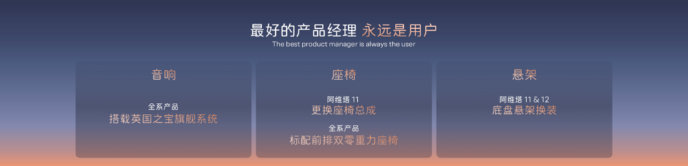 用户对原来的音响不满意,阿维塔选择与英国之宝展开战略合作,全系产品搭载英国之宝音响的旗舰系统,为用户带来顶级的听觉享受。此前,品牌还为所有阿维塔11老车主提供座椅个性化改装方案,并通过后续的产品发布和更新,成为全球首个全系标配前排双零重力座椅的品牌,让阿维塔用户坐享云端体验。