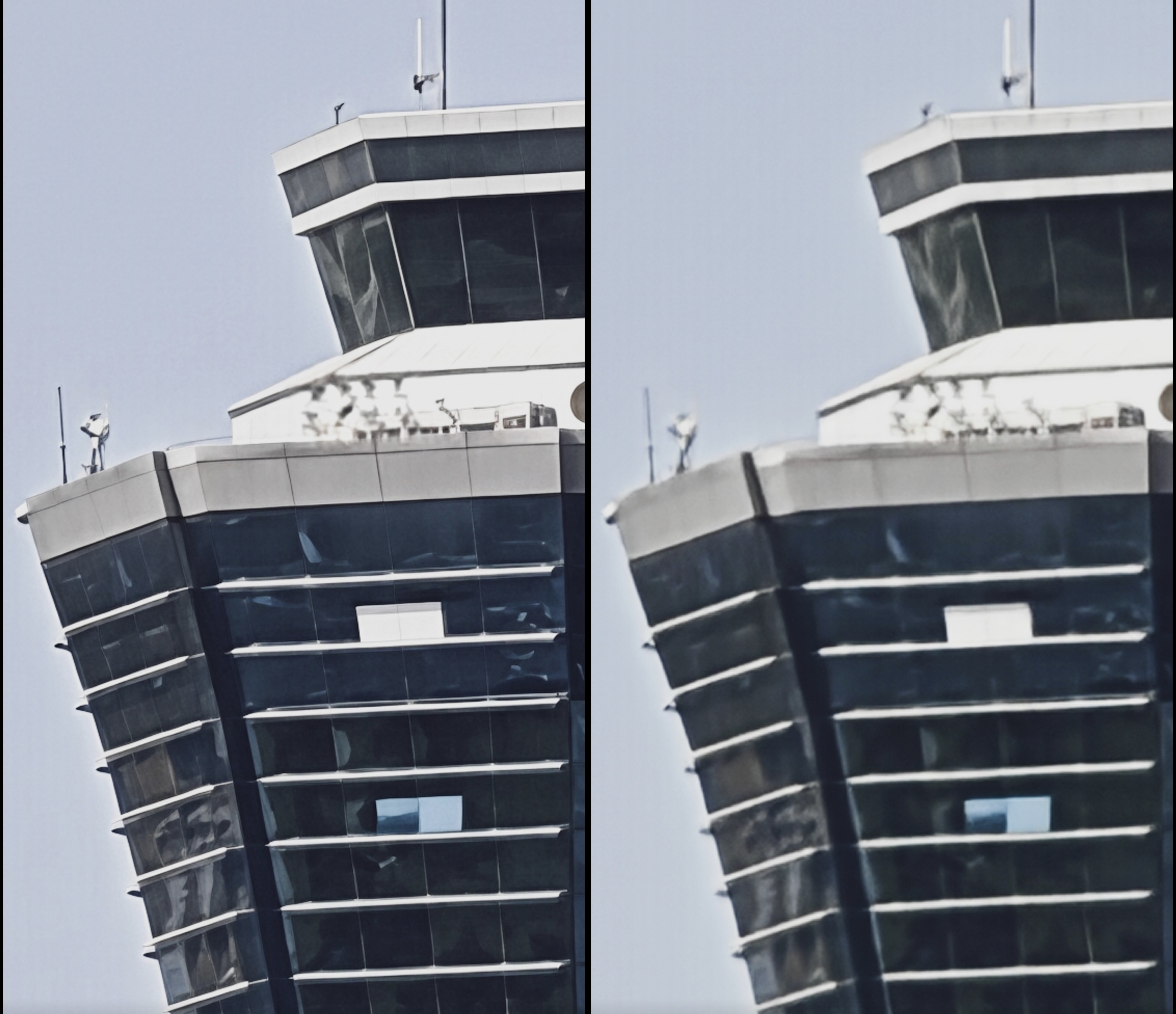 先跟Magic V5自己对比,激活AI长焦拍摄之后,图片处理需要10秒左右(信号不好的地方要更久),系统相册会保留AI优化后和原图的对比。看30倍下的机场塔楼,完全靠数字裁切拍下来的图片,只能分辨出塔楼上简单的几个型面,而AI处理之后,玻璃窗反光有了,窗线更加锐利了,AI补充了不少画面细节,观感有显著提升。