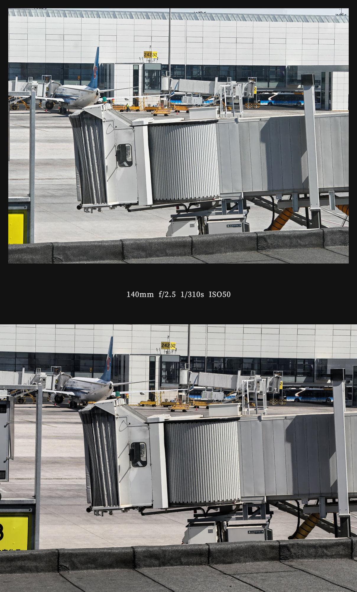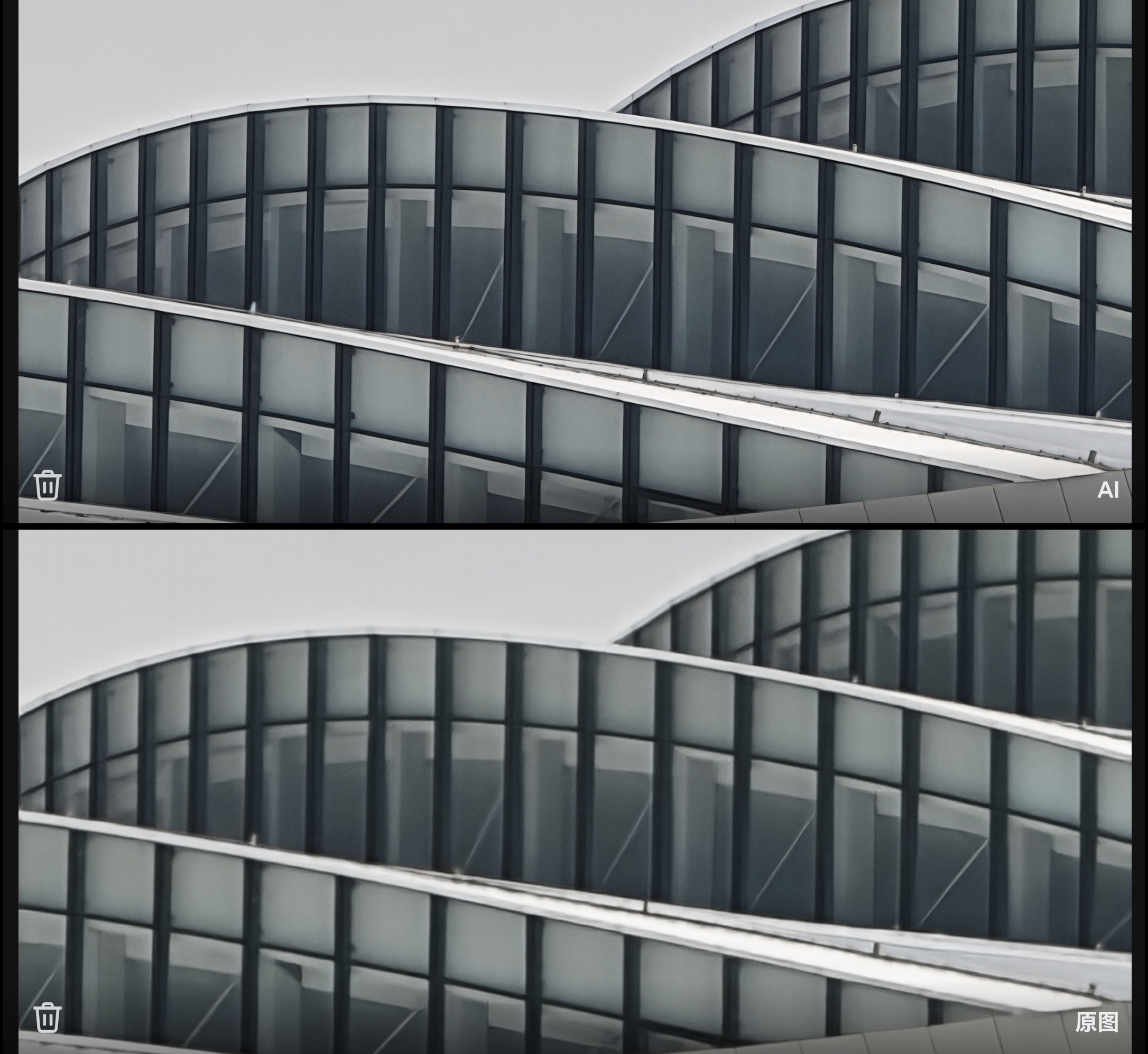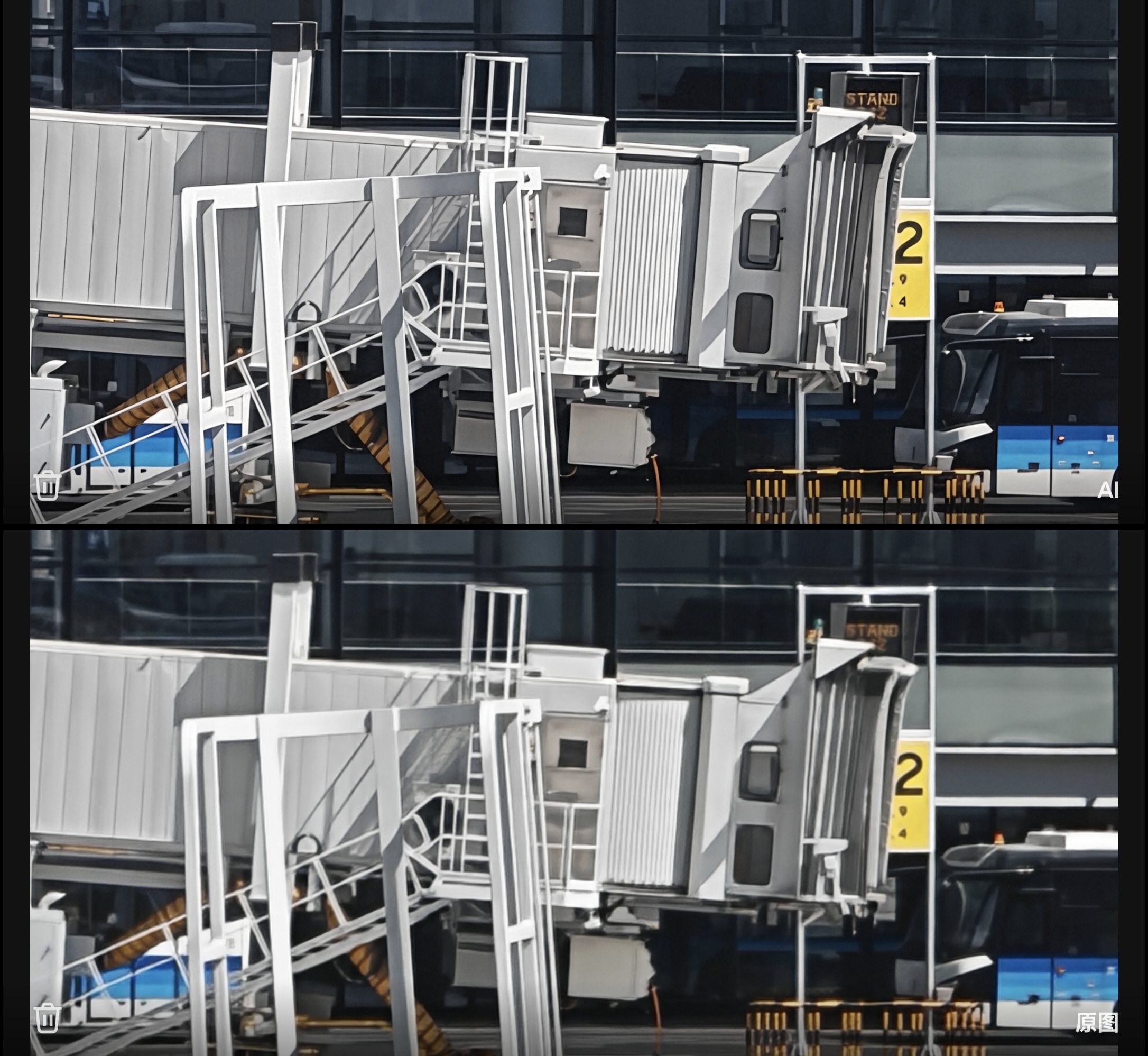 我发现,机场里的基本都是人造物,像窗线、窗玻璃、金属杆等元素,都是十分有规律的,云端AI大模型里具备对应的特征数据,也便于后期AI优化,因此处理之后的图片,画面质量往往会比原图稍高。