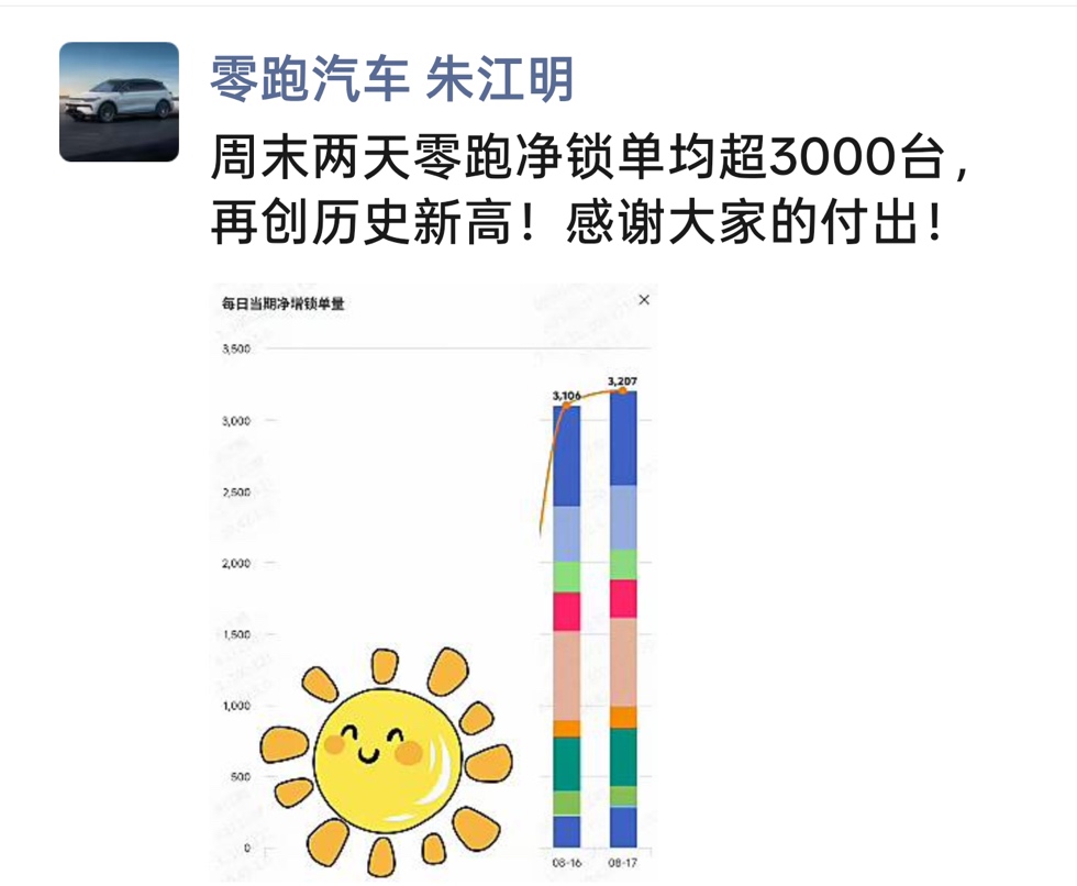 零跑汽车创始人、董事长兼CEO朱江明8月17日深夜在社交平台发出周末战报:周末两天净锁单均超3000台,再创历史新高!以B系列和C系列为核心,零跑基于全域自研技术实力的产品竞争力和用户口碑,正在持续释放中。这一“零跑现象”已充分证明,无论是消费者还是投资人,市场最终认可的是优质的产品和优秀的口碑。