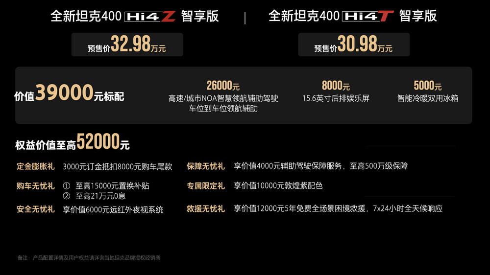 10月21日,主题为“潮酷越野新时代”的全新坦克400预售发布会成功举行,全新坦克400 Hi4-Z智享版,预售价32.98万元;全新坦克400 Hi4-T智享版,预售价30.98万元。