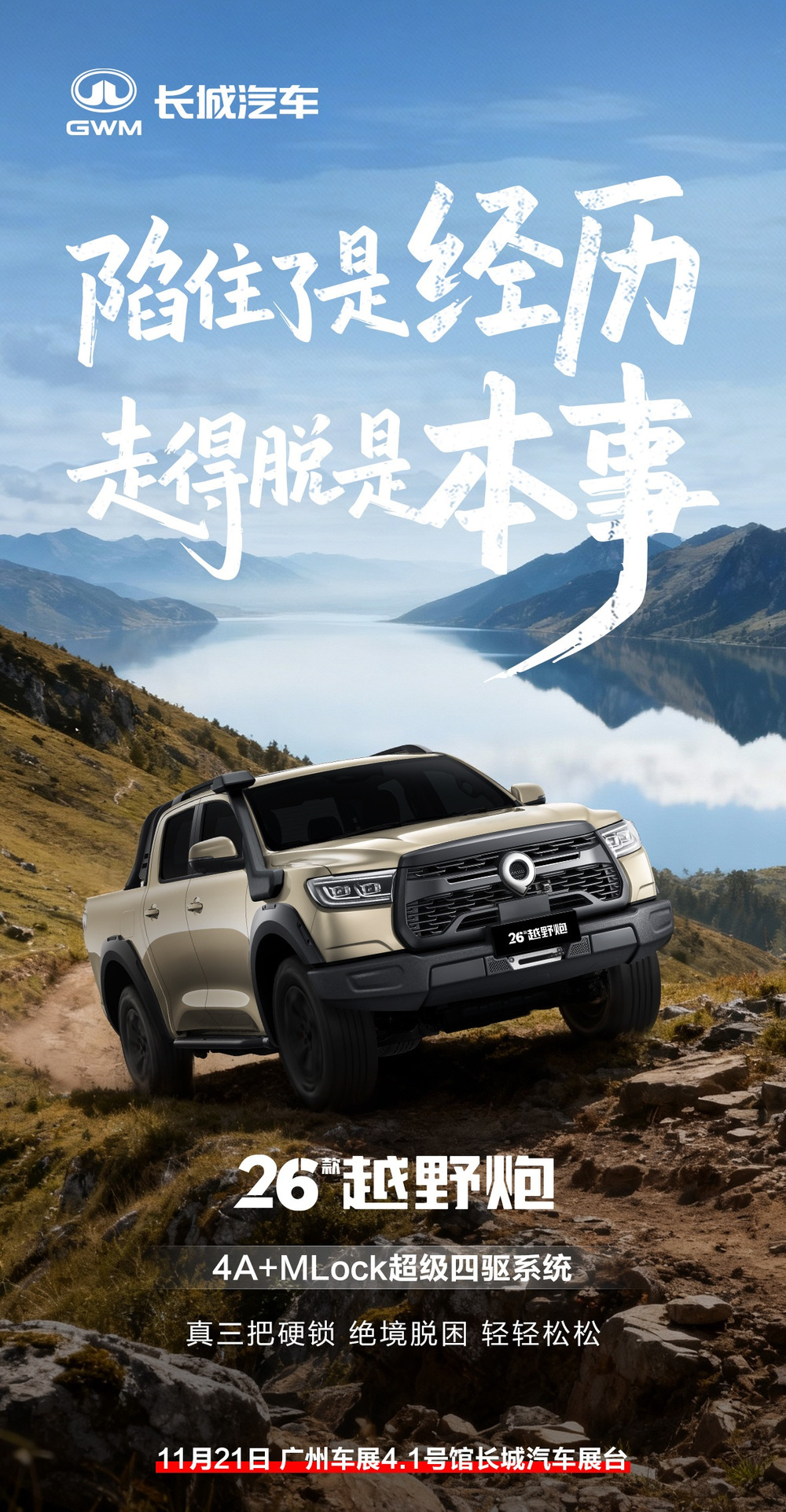 2026 款越野炮搭载 4A+MLock 超级四驱系统,号称“真三把硬锁,绝境脱困,轻轻松松”。