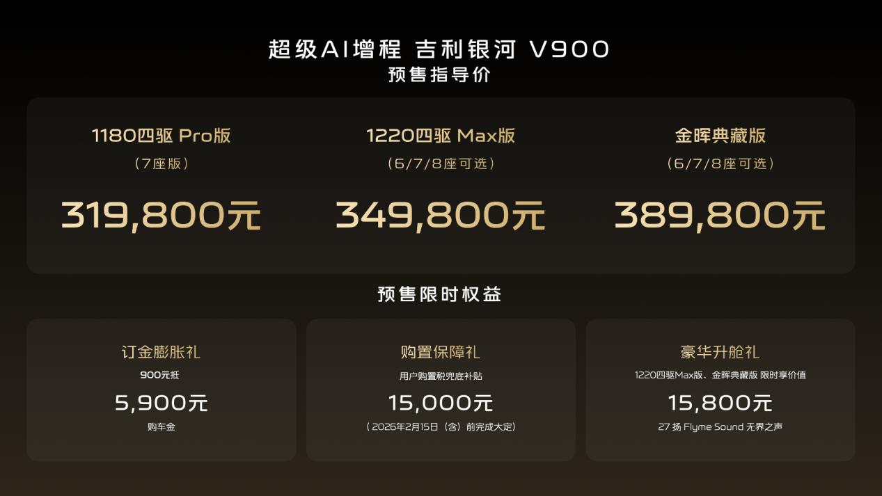 1月7日,吉利银河旗下V系列的首发之作,“AI全场景家庭旗舰MPV”——吉利银河V900正式开启预售,共计3个版本,预售指导价格区间为31.98万元~38.98万元。