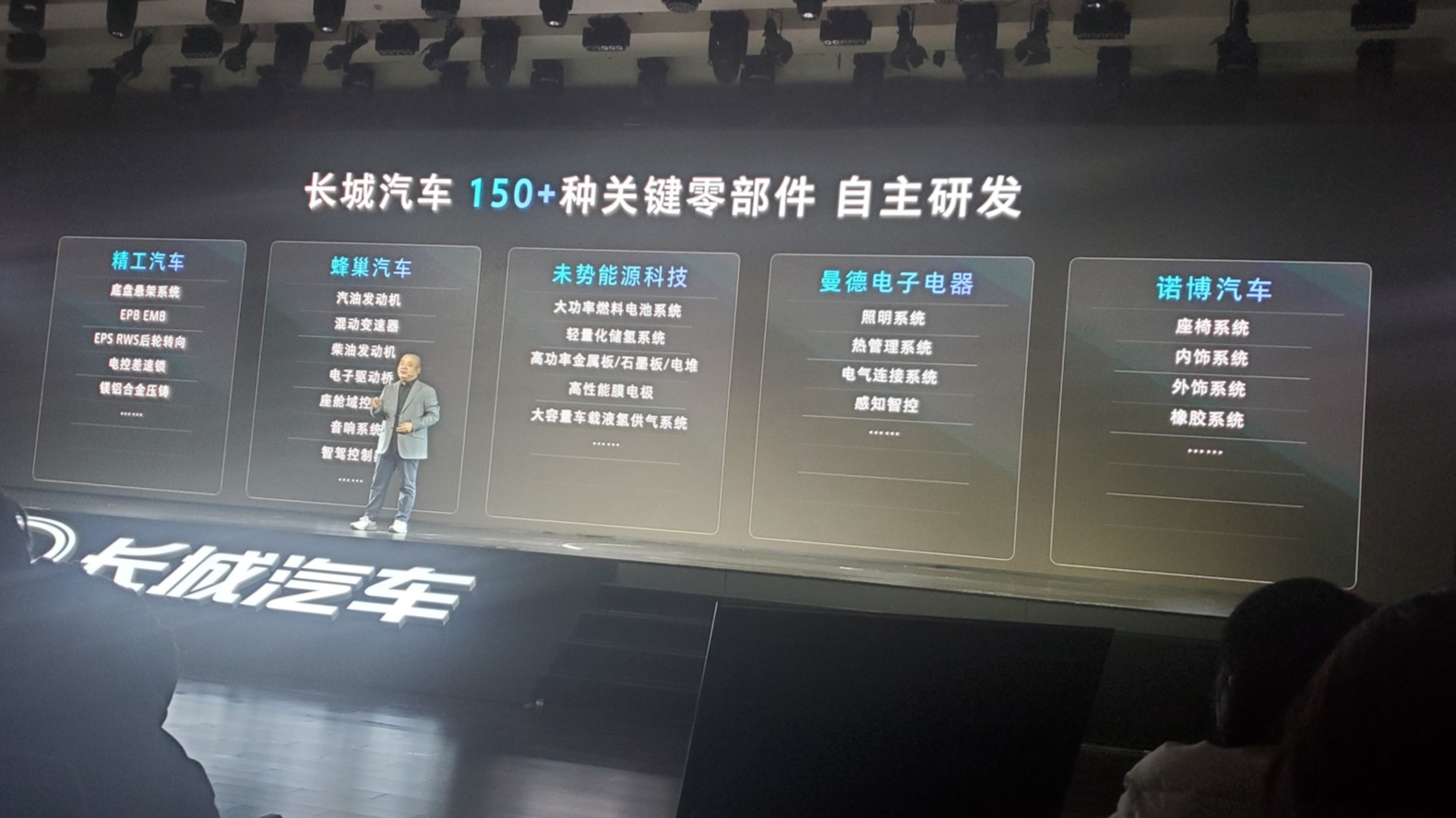长城汽车的穆峰总在发布会上特别强调了一点,那就是他们对核心技术的掌控力。从研发到制造工艺,从最底层的算法到严苛的质量管理,长城汽车都坚持自主研发和垂直整合。这可不是说说而已,他们已经实现了超过150种关键领域的自制!你可以想象一下,无论是横置还是纵置的汽柴油发动机,电池、电机、电控这些“三电”核心,甚至是氢燃料系统,还有空气弹簧、转向器、车架、座椅这些看似不起眼的部件,以及座舱域控制器、智驾域控制器、各种雷达、音响、空调、热管理、灯具、密封件等等,几乎涵盖了车辆的方方面面。这种全方位的自研实力,不得不让人佩服。