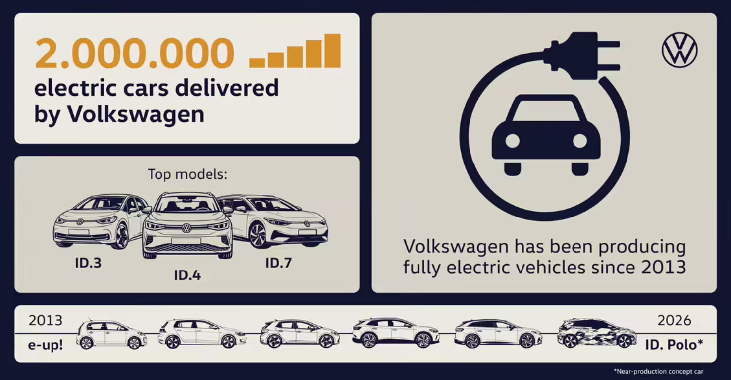 大众的电动化征程始于 2013 年,当年推出 e-up!,此后便持续扩充纯电产品阵容。这 200 万辆纯电动乘用车(BEV)不仅包含当下的 ID. 家族车型,也涵盖 e-up!、e-Golf 等早期电动车型。如今,大众已在德国及欧洲纯电市场占据领先地位,跻身销量最高的供应商之列,同时也是全球规模最大的电动汽车制造商之一。