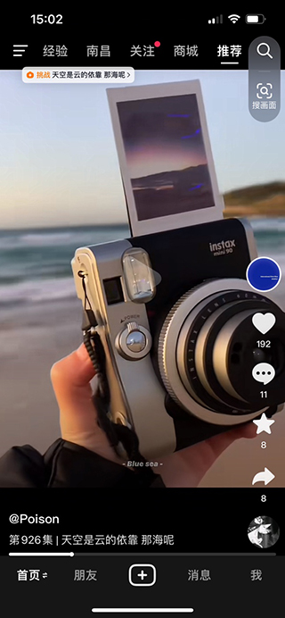 抖音进入的主界面整体采用黑色作为背景,顶层导航栏包括经验分享、关注、商城以及推荐选项,右侧还有一个搜索按钮,底部导航栏包括首页、朋友、拍摄视频、消息以及我的界面,整体来说还是较为简洁的。