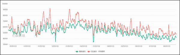 七麦近一年的下载量数据也表明QQ音乐和酷狗音乐的数据都是蛮高的,只不过QQ音乐的下载量更高一些。