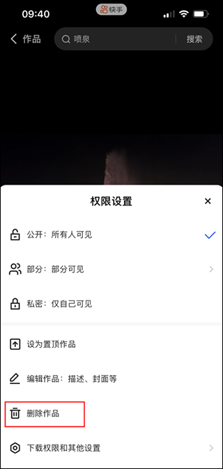 4、在弹出的权限设置页面点击“删除作品”选项;