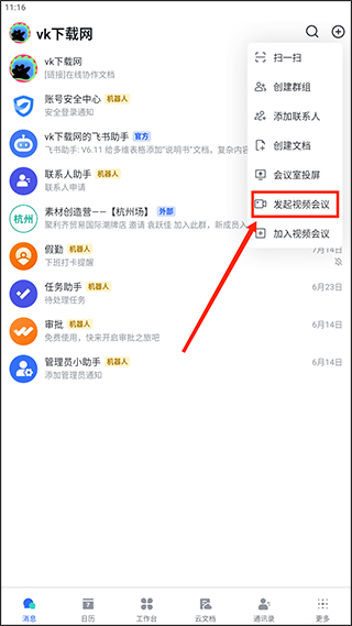 2、打开后,选择【发起视频会议】,点击打开。