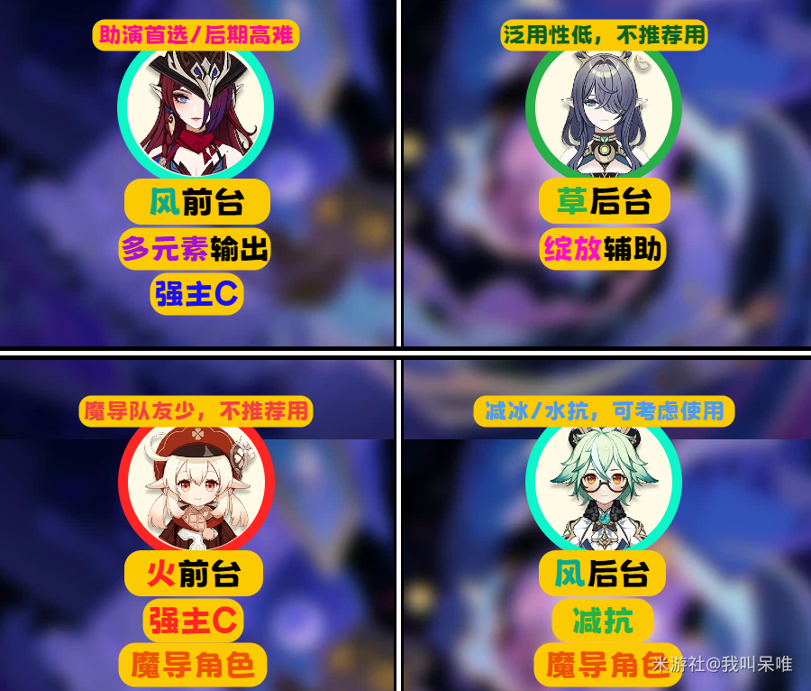 T2:单人输出素质偏弱的角色,其中可莉需要魔导进一步解放输出,再加上并不是本期主推元素,故优先级不高。