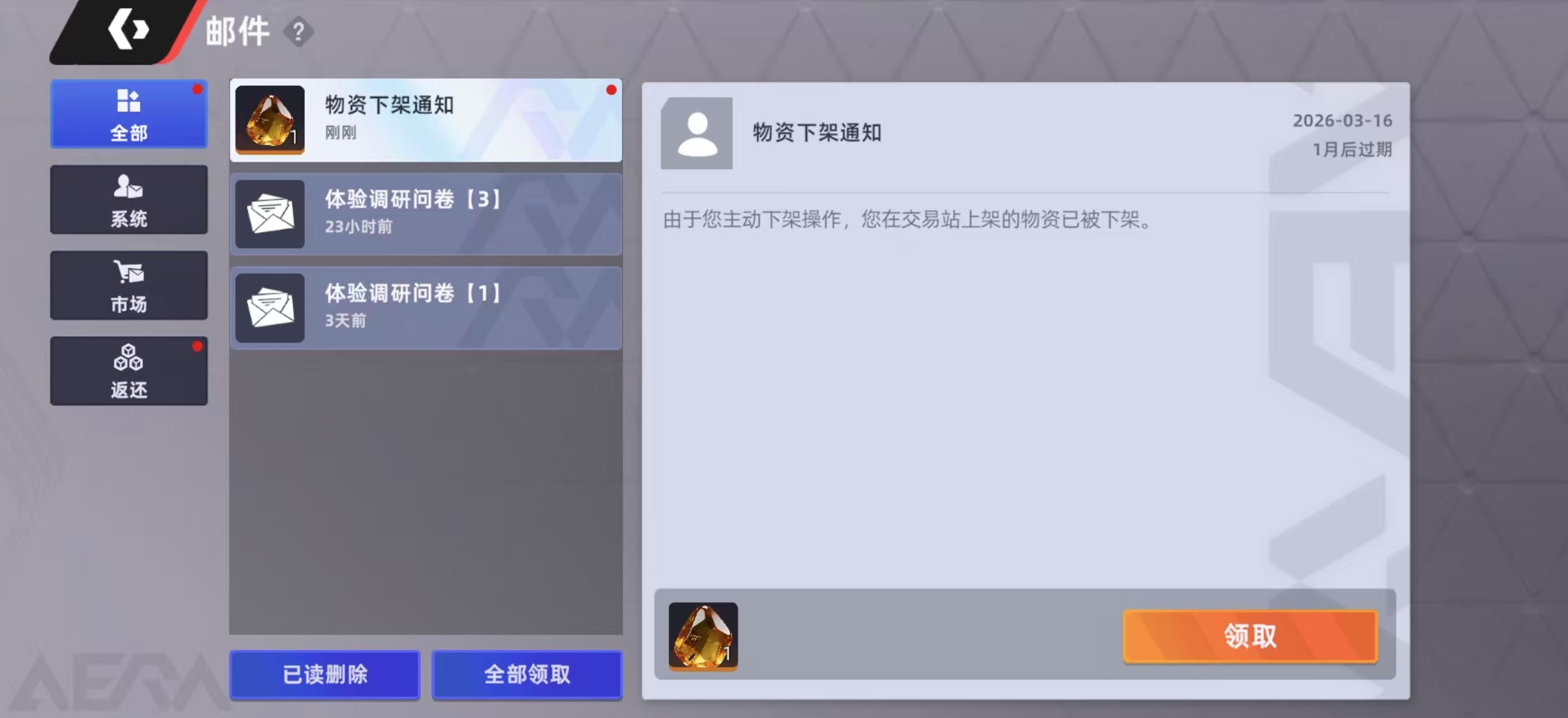 如果出售出去后就会在邮件中拿到收益,注意上架需要收取管理费用,在上架时从仓库中直接扣除对。成交之后也会收取对应的手续费,会在成交额中扣除。所以在交易站中出售虽然价格会高一些,但是也要考虑手续费问题。而且这里并不是所有的道具都可以出售,一些磨损严重的武器和低价值的商品无法出售。上架之后也可以自己选择退还,退还的商品同样会在邮件中出现,注意领取。