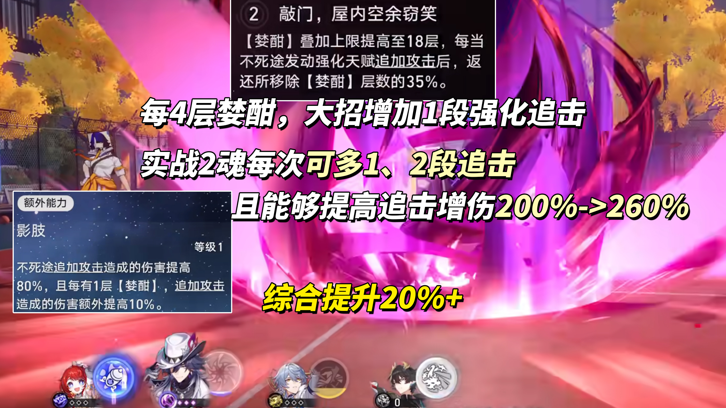 婪酣叠加层数从12提升至于18,并且施放终结技返还35%婪酣消耗。对不死途自身来说,最高追击增伤从200%提升至于260%,返还的婪酣确保不死途每次大招都能多触发1、2次追加攻击。综合提升20%+。