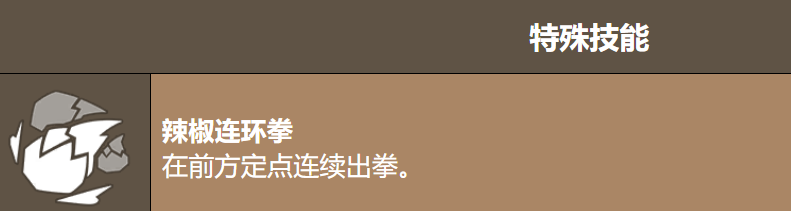 基础攻击是辣椒正拳,能连续出拳最多四下。这套连招打起来节奏比较快,积累被动进度条的速度还不错,正常战斗里主要就靠这个推进度。蓄力技能叫辣椒刺击拳,就是伸拳向前冲,蓄力时间越久,打出去的伤害就越高。这个技能有两个用途,一个是输出,另一个就是刚才说的——配合被动满进度条之后用,给队友上护盾。两个功能其实是同一个动作,只是条件不一样,挺有意思的设计。
